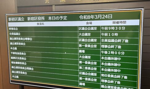 こんばんは。新宿区議会議員の伊藤陽平です。 本日は予算特別委員会の最終日でした。会派の新宿未来の会からはたなえひさし委員がしめくくり質疑を担当しました。私は予算委員ではないので傍聴席で応援をしていました。 会派拘束がない…